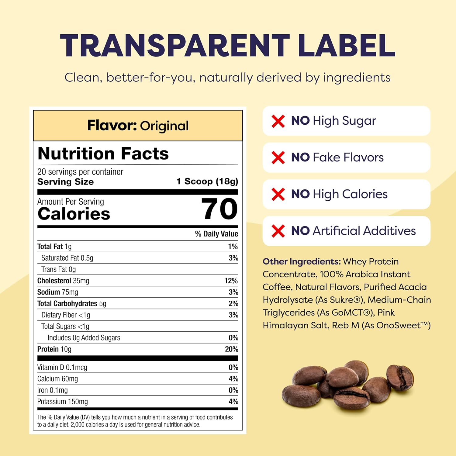 Nuestro café proteico está hecho de solo tres ingredientes, incluida la proteína de suero, el café 100% arábica y el sabor natural. ¡Utilizamos ingredientes de origen natural, limpios y sin gluten sin ningún colorante, colorante, conservante o edulcorante artificial.